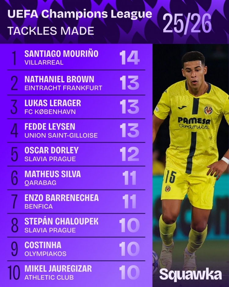 10月23日讯 本赛季欧冠联赛阶段已战罢3轮,Squawka统计了到现在截止的铲球榜单,比利亚雷亚此后卫圣地亚哥-穆里尼奥14按序一,法兰克福后卫布朗等三东说念主13次分列二至四位。