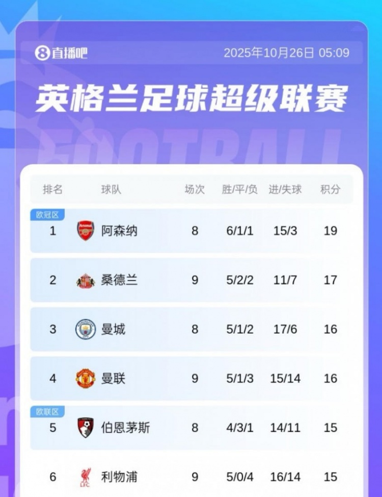 10月26日讯 2025-26赛季英超第9轮,曼联4-2驯顺布莱顿,升至积分榜第4,暂时和榜首的阿森纳收支3分。