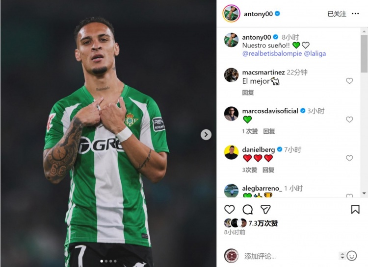 安东尼此役2射1传,当选全场最好球员,赛后他在酬酢媒体上晒出比赛像片,庆祝球队取胜,配文:“咱们的梦思!”