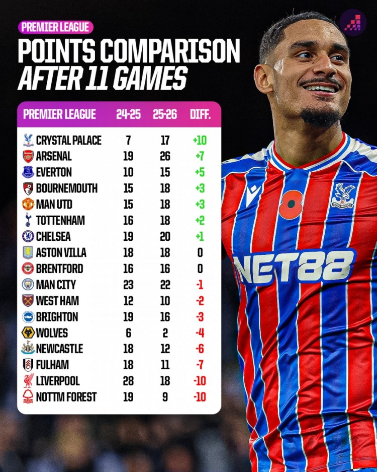 11月14日讯 Opta统计了英超球队本赛季前11轮比赛与上赛季同时积分的变化,比肩出榜单,水晶宫+10分擢升最大,阿森纳+7分,利物浦-10分。