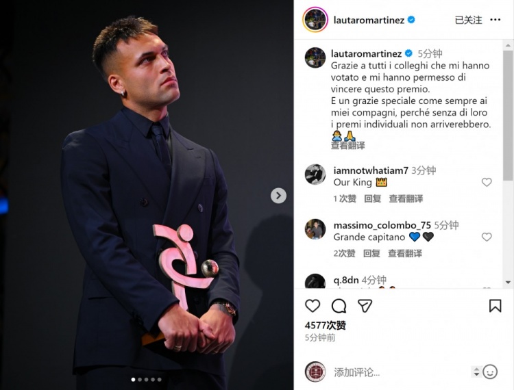 劳塔罗社媒晒出领奖的相片,并写说念:“感谢通盘投票援救我的球员,是你们让我赢得了这个奖项。”