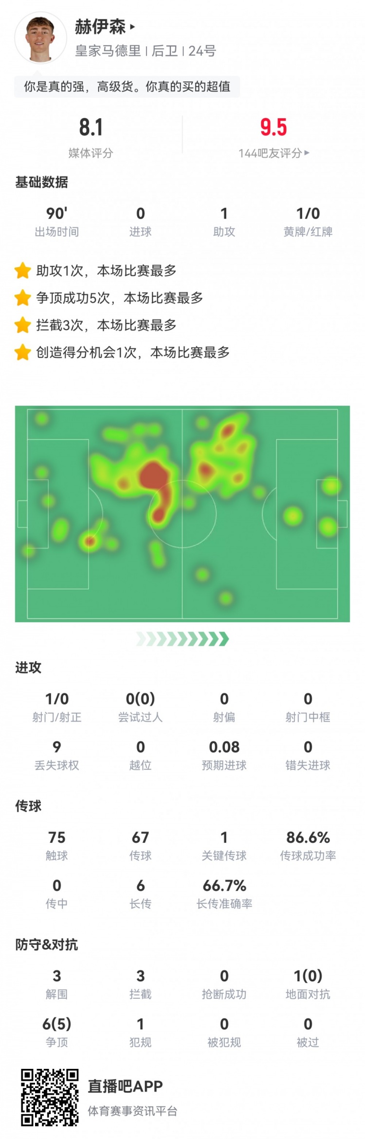 8月31日讯 西甲第三轮,皇马2-1马洛卡。此役赫伊森首发打满全场,球员全场重心数据如下↓