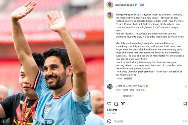 9月3日讯 34岁的德国中场京多安依然官宣加盟加拉塔萨雷,他也通过社媒发布了向曼城的告别信: