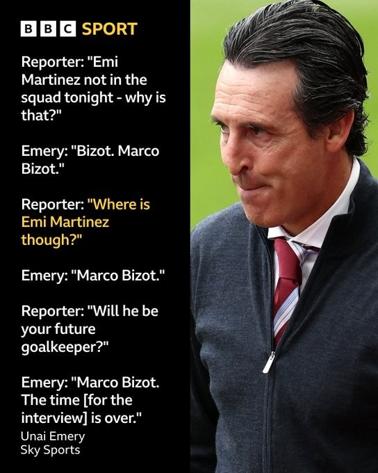 赛前,维拉主帅埃梅里曾阻隔回报大马丁的关连问题,一说念以“比佐特”作答。