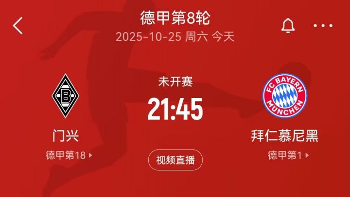 10月25日讯 官方音书,拜仁vs门兴比赛推迟至北京时间21:45开球。