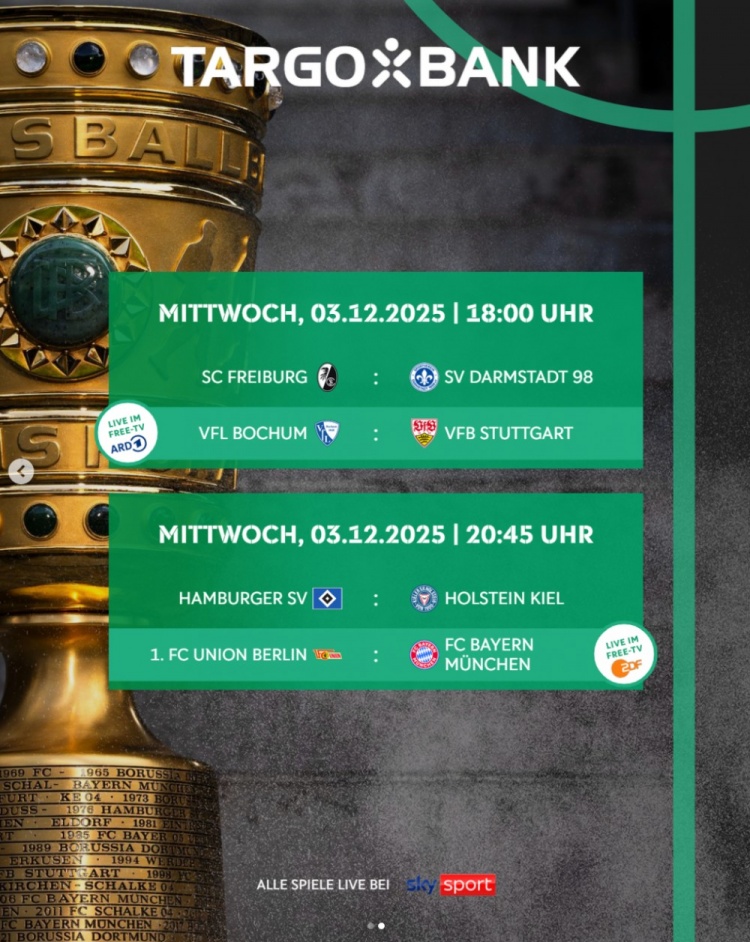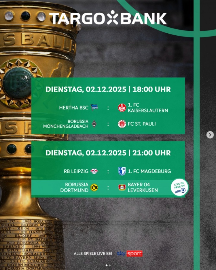 11月6日讯 德国杯1/8决赛各场开球本事公布,12月3日4点勒沃库森vs多特蒙德,4日3点45柏林归并vs拜仁。