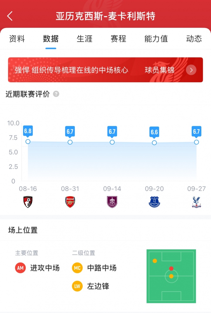 麦卡利斯特本赛季开赛后,推崇平平。现在2个月来的英超比赛以及两场欧冠比赛莫得一场媒体评分达到7分。