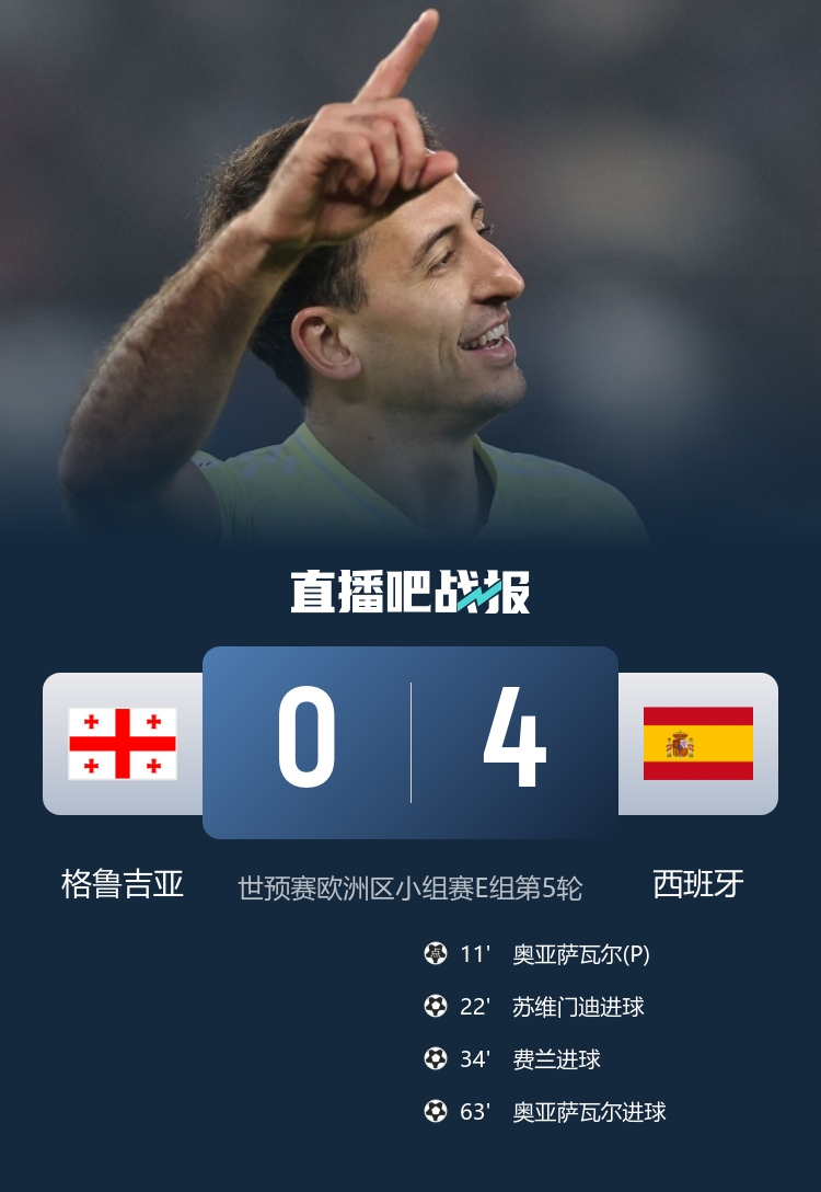 奥亚萨瓦尔双响,苏维门迪、费兰立功,西班牙4-0格鲁吉亚。