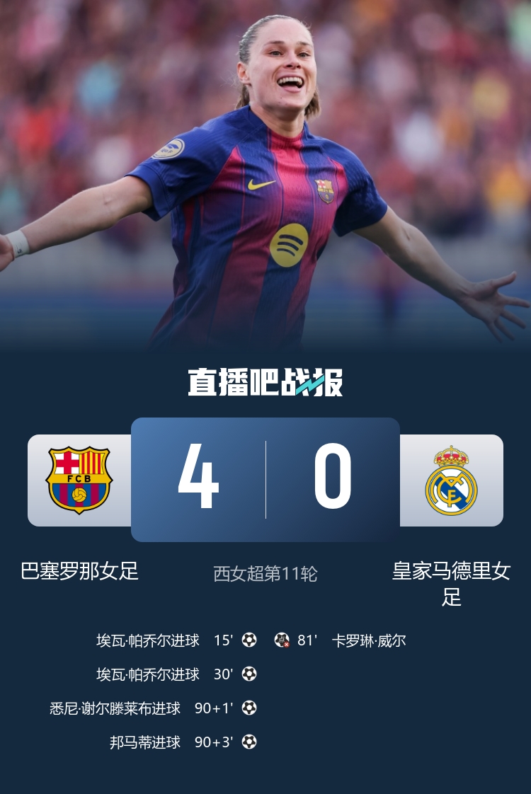 西女超-巴萨女足4-0皇马女足 帕乔尔双响邦马蒂替补立功威尔失点