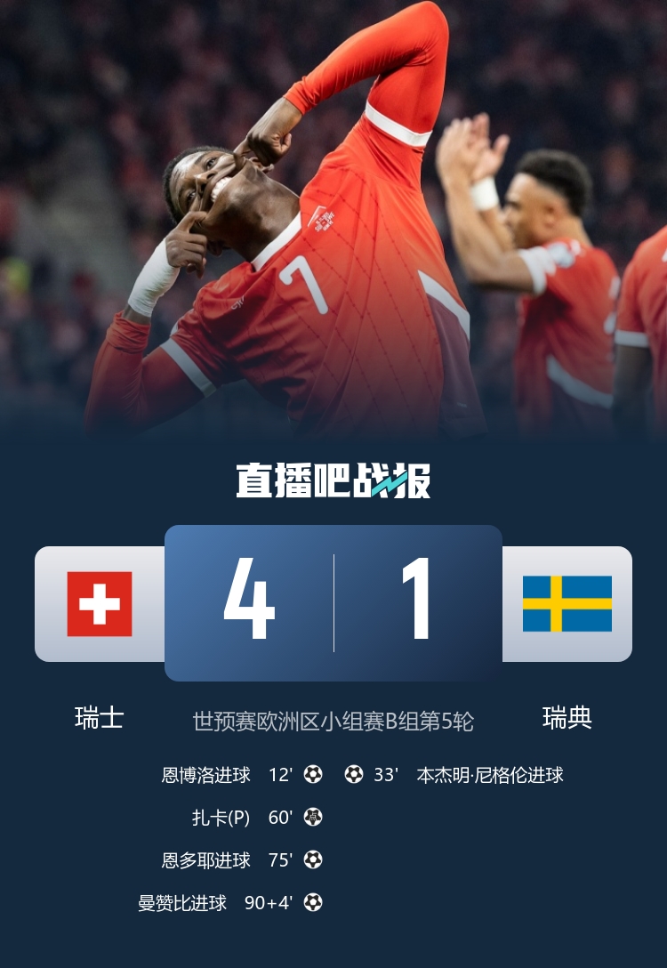 瑞士主场4-1慑服瑞典,瑞士积13分位居榜首,擢升第2名科索沃3分+11粒净胜球,瑞典5轮不堪链接垫底。