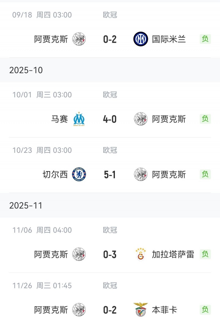 本赛季阿贾克斯在欧冠说明灾祸,前5轮比赛他们全败,丢16球仅打入1球,基本不错宣告无缘淘汰赛,他们剩下的3个敌手是卡拉巴赫、比利亚雷亚尔和奥林匹亚科斯,阿贾克斯的指标即是能拿下一场班师。