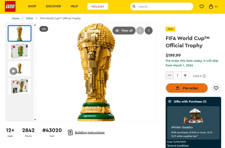 12月03日讯 FIFA官方发布音书,海外足联与乐高集团合作推出1:1复刻的甘休神杯。