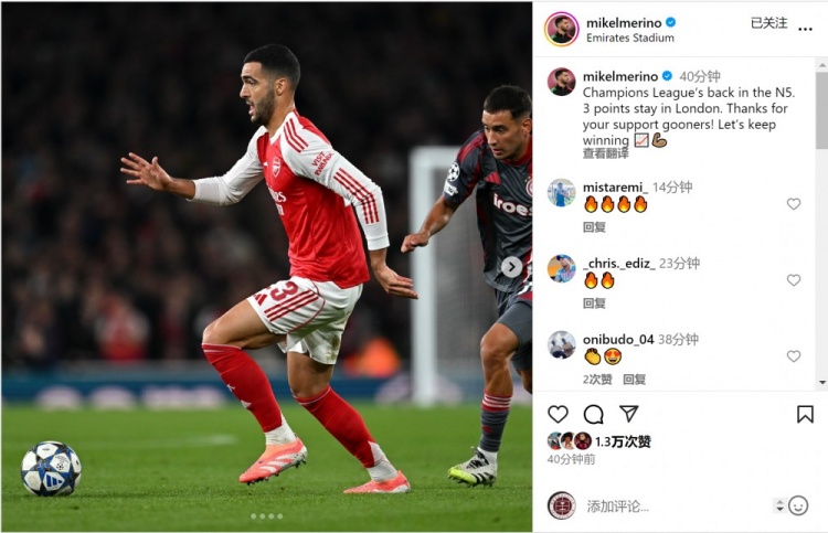阿森纳中场梅里诺社媒晒出比赛相片,并写说念:“欧冠重回北五区,将3分留在伦敦。”