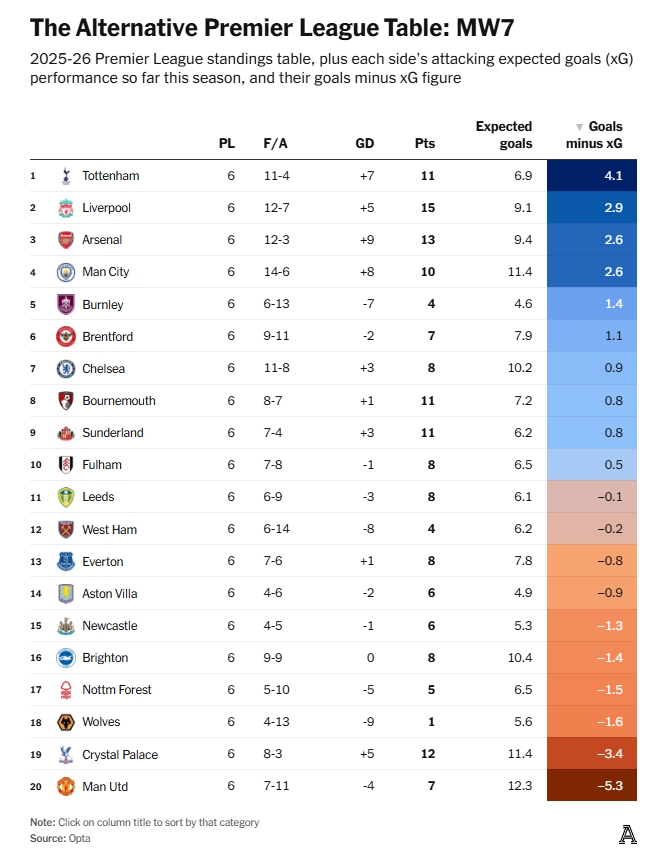 在本赛季英超预期进球值与践诺进球值榜单中,热刺是发达最佳的,他们践诺进球比预期进球多4.1个,利物浦(2.9个)、阿森纳(2.6个)、曼城(2.6个)分居二至四位。