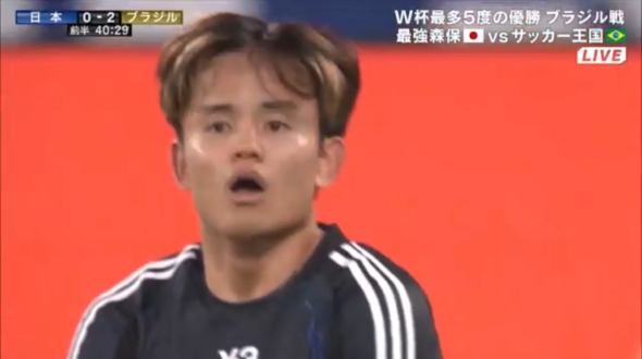 10月14日讯 海外友谊赛麒麟挑战杯,日本队主场迎战巴西队。比赛第40分钟,久保建英在巴西禁区内倒地,韩国裁判莫得示意,久保建英感到十分困惑。