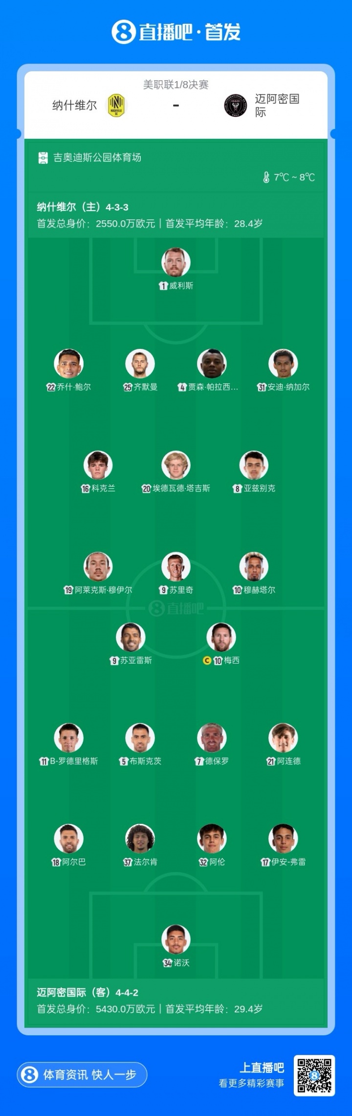 11月02日讯 好意思职联1/8决赛,迈阿密国外客战纳什维尔,赛前两边首发公布。