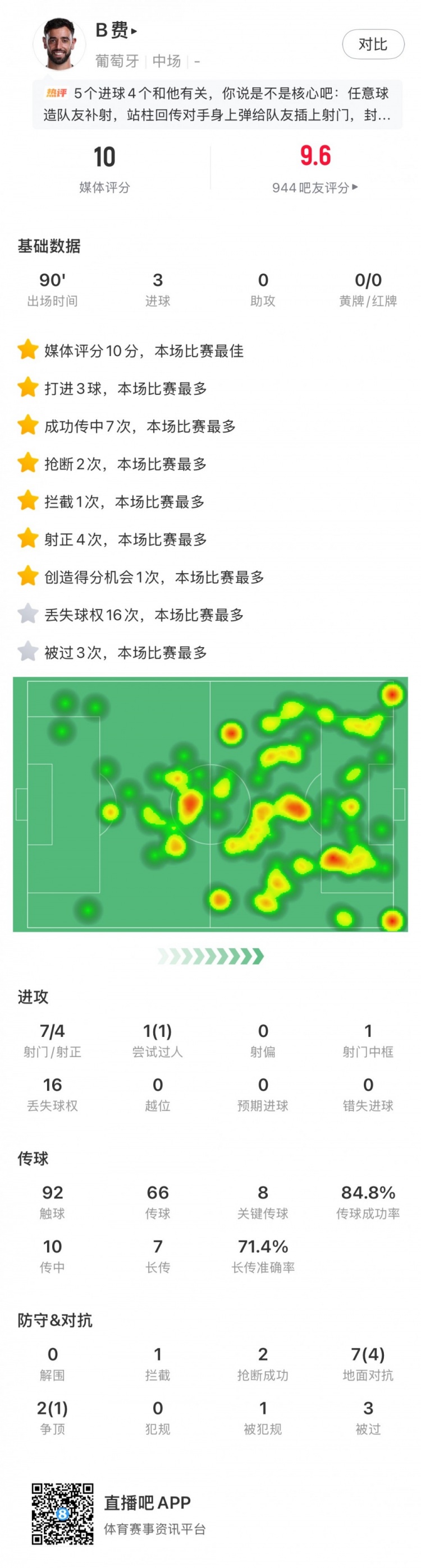 触球92次,传球66次,传球胜利率84.8%