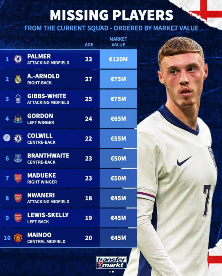 直播吧11月17日讯德转盘货了缺席本期英格兰名单球员身价榜,具体如下: