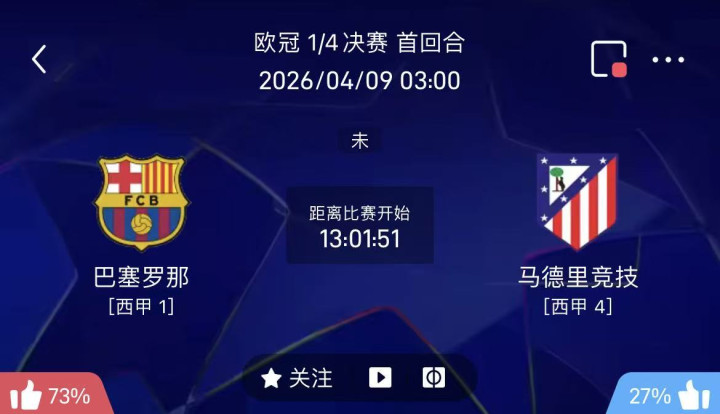 周三004欧冠:巴塞罗那VS马德里竞赛 赛事 时间:2026-04-09 03:00
