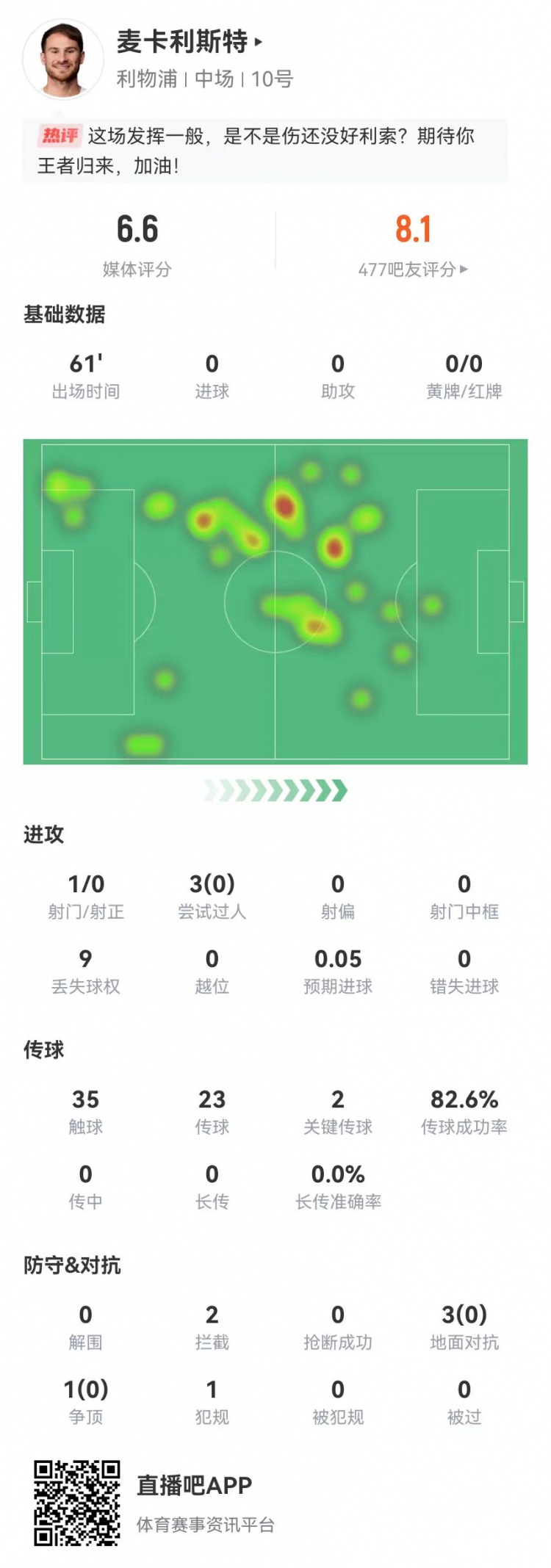 9月1日讯 利物浦在本轮英超1-0绝杀阿森纳,麦卡利斯特本场数据如下: