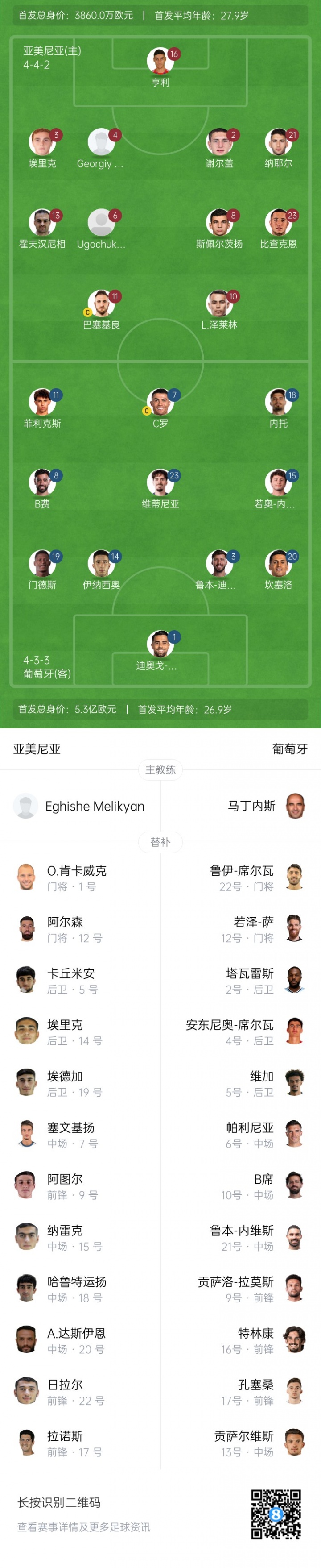 葡萄牙首发:1-迪奥戈-科斯塔、19-努诺-门德斯、3-鲁本-迪亚斯、14-伊纳西奥、20-坎塞洛、15-若奥-内维斯、23-维蒂尼亚、8-B费、11-菲利克斯、18-内托、7-C罗