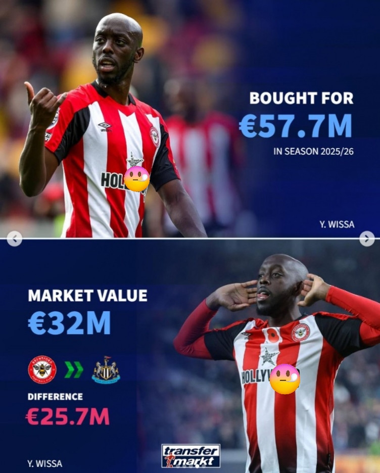 维萨:以5770万欧元的转会费从布伦特福德加盟纽卡斯尔,身价3200万欧元,溢价2570万欧元。