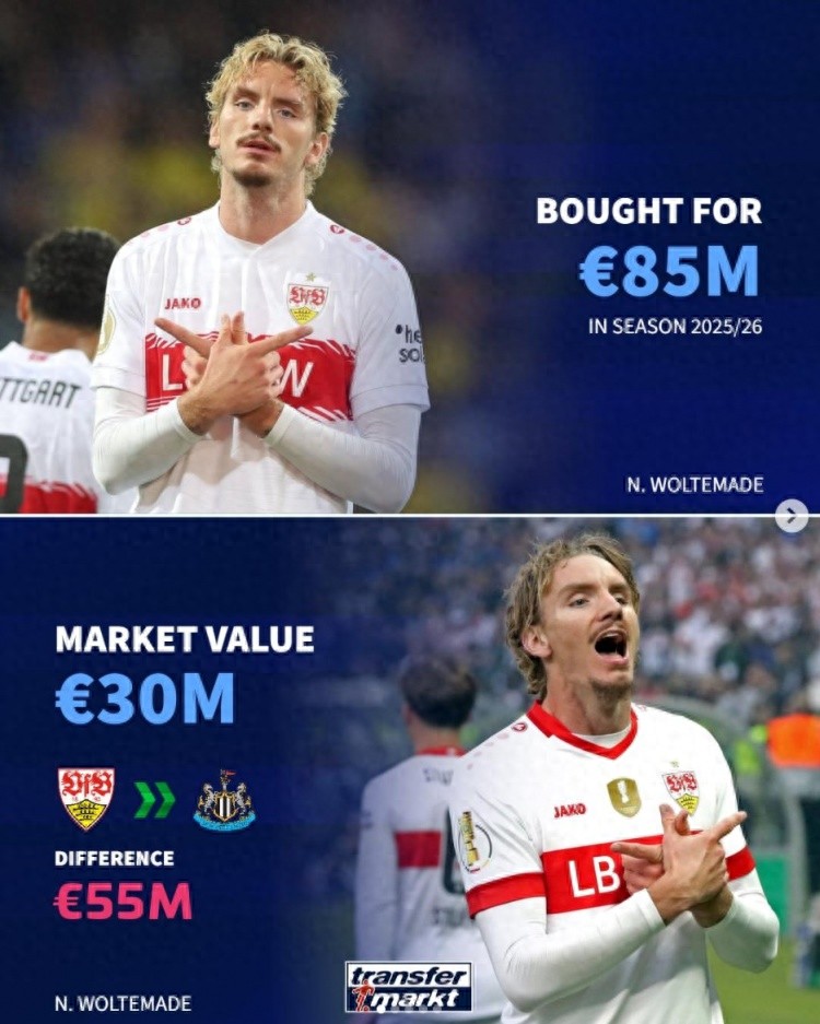 沃尔特马德:以8500万欧元的转会费从斯图加特加盟纽卡斯尔,身价3000万欧元,溢价5500万欧元。