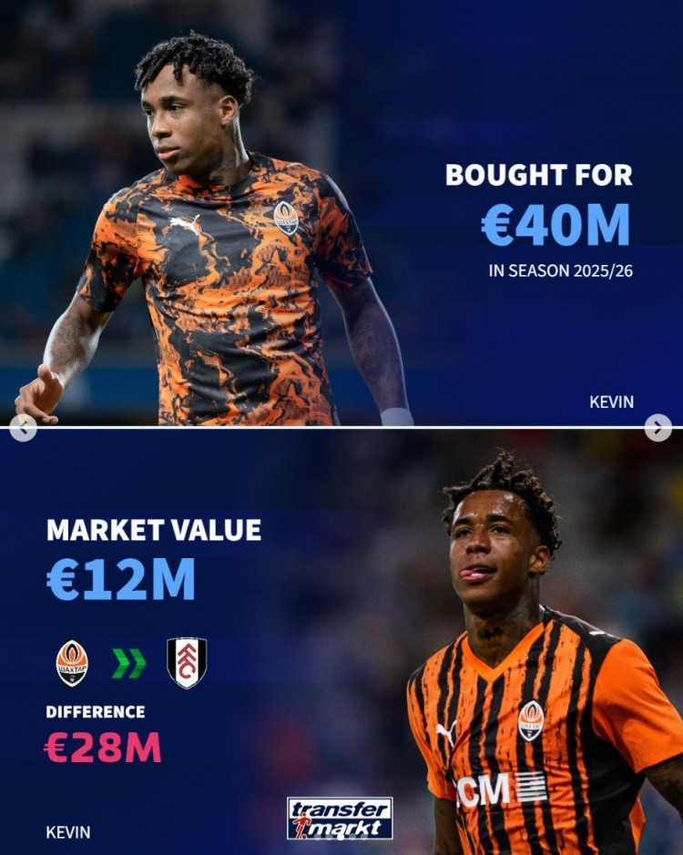 凯文:以4000万欧元的转会费从顿涅茨克矿工加盟富勒姆,身价1200万欧元,溢价2800万欧元。
