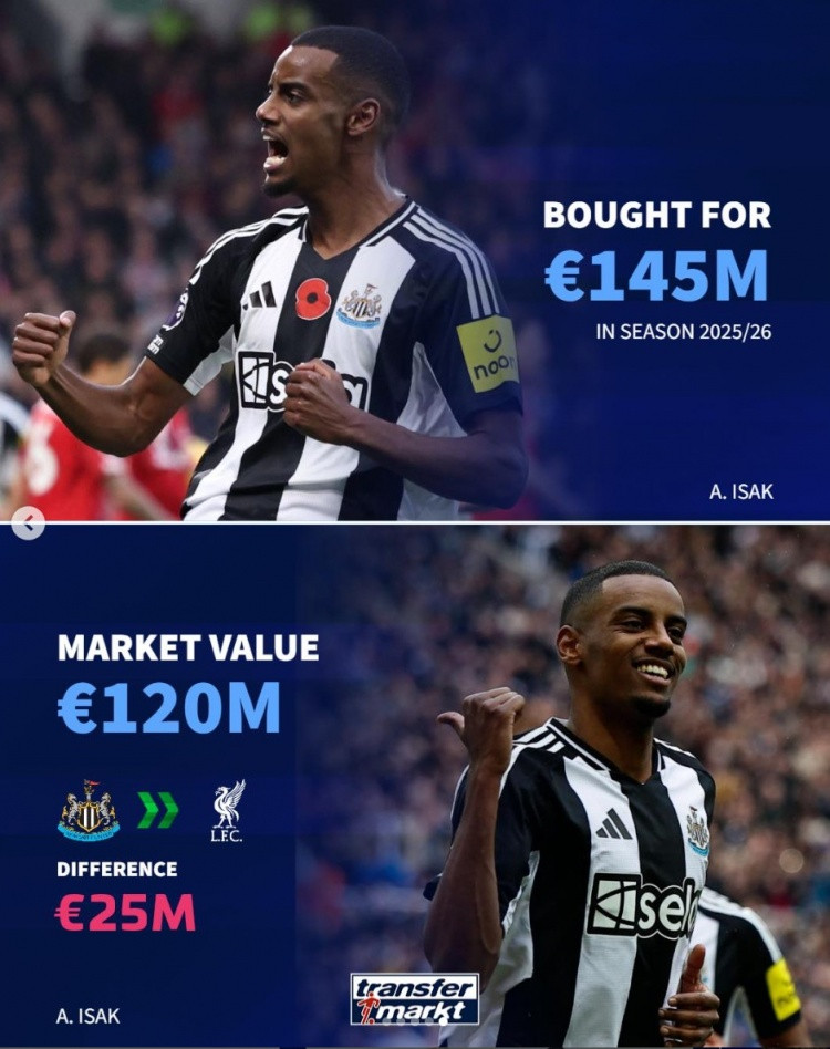 伊萨克:以1.45亿欧元的转会费从纽卡斯尔加盟利物浦,身价1.2亿欧元,溢价2500万欧元。