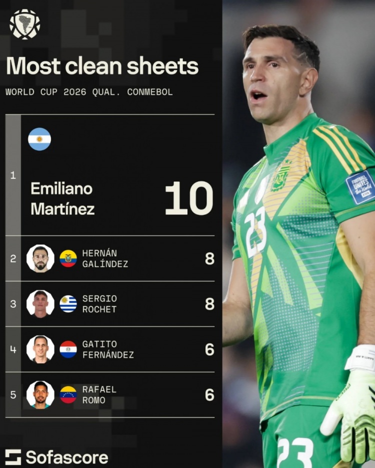 9月11日讯 本届南好意思世初赛限制,Sofascore统计了门将零封的场次,比肩出榜单,大马丁10场零封居首。