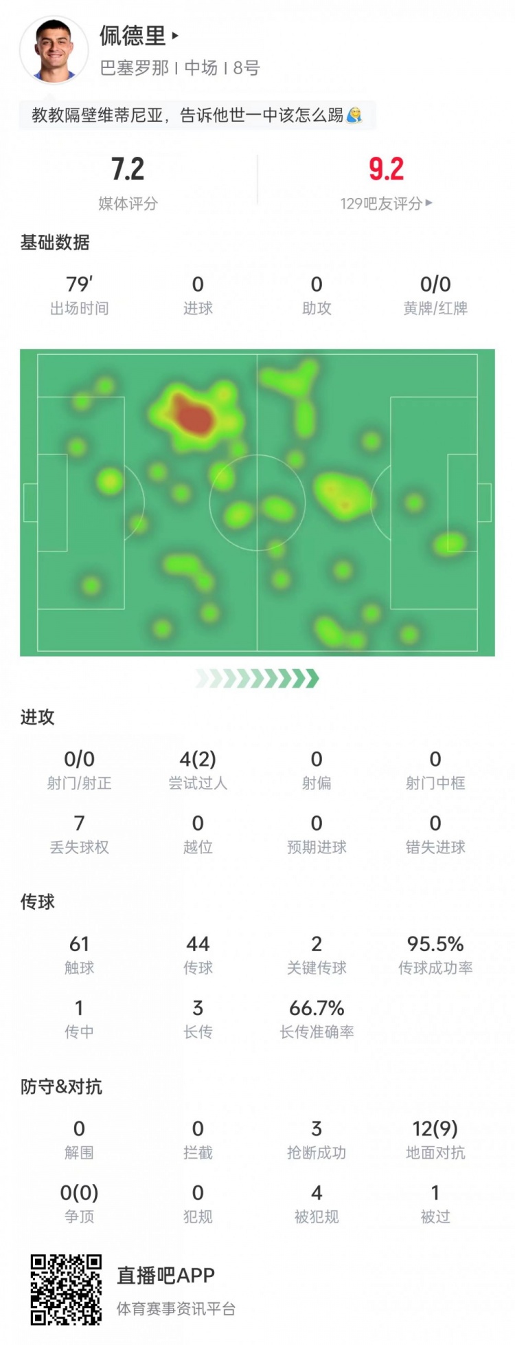10月2日讯 巴萨主场对阵巴黎的欧冠联赛阶段第二轮比赛,佩德里为巴萨首发出战,第79分钟被换下。