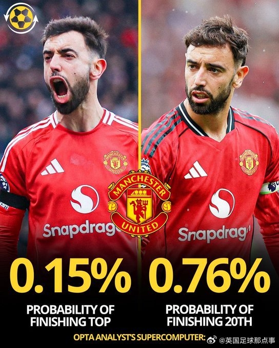证实Opta超算测度,本赛季曼联在英超排在第20名的概率居然比夺冠还高🤯