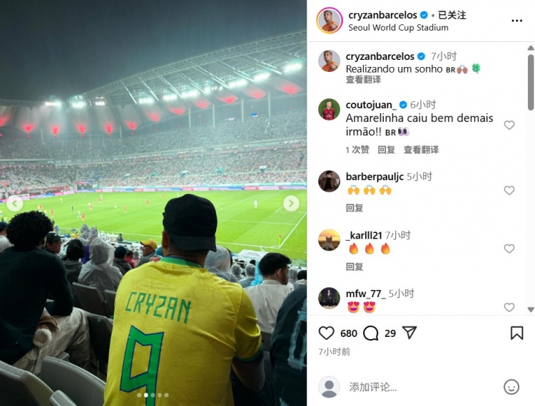 此役山东泰山外助克雷桑身穿我方名字的巴西9号球衣,现场见证了巴西的大捷。