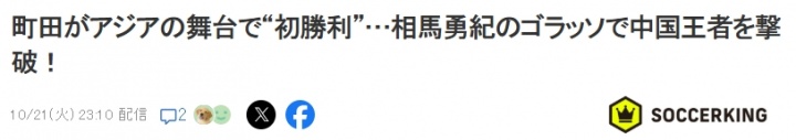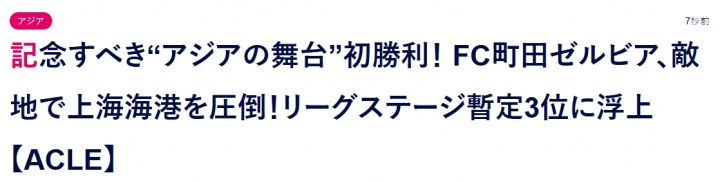 赛后部分日媒的报谈标题包括:《值得缅思的“亚洲舞台”首胜!町田泽维亚客场爆冷打败上海海港,暂居亚冠精英联赛第三》、《町田在亚洲赛场的首胜!相马勇纪的精彩进球匡助球队打败了中国冠军》等。