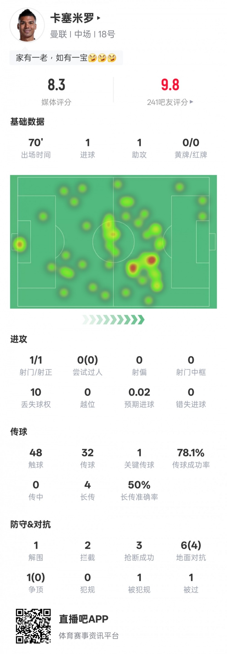 10月26日讯 2025-26赛季英超联赛第9轮,曼联主场迎战布莱顿。卡塞米罗首发出战,传射立功,还送出1次关节传球,3次抢断,评分8.3。