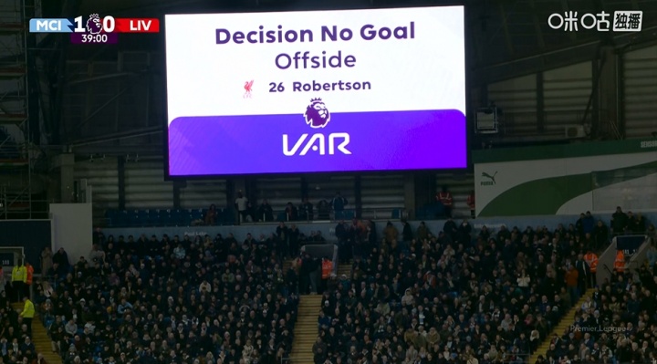 曼城3-0利物浦比赛的第38分钟,范戴克头球破门,但VAR判定罗伯逊越位位置骚扰,进球被判无效。