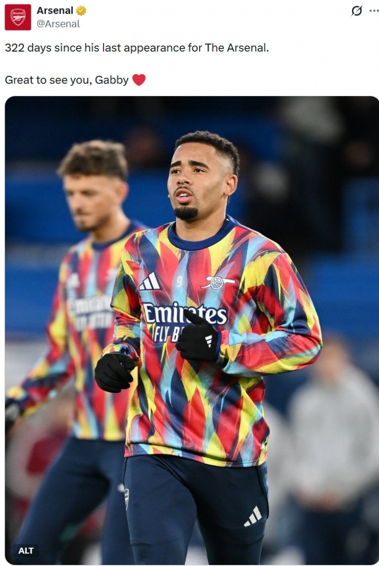 本场比赛热苏斯归来球队名单替补待命,阿森纳官推也晒出热苏斯赛前热身相片,配文写谈:“前次为球队出场照旧是322天前,很欢叫看到你归来,热苏斯!”