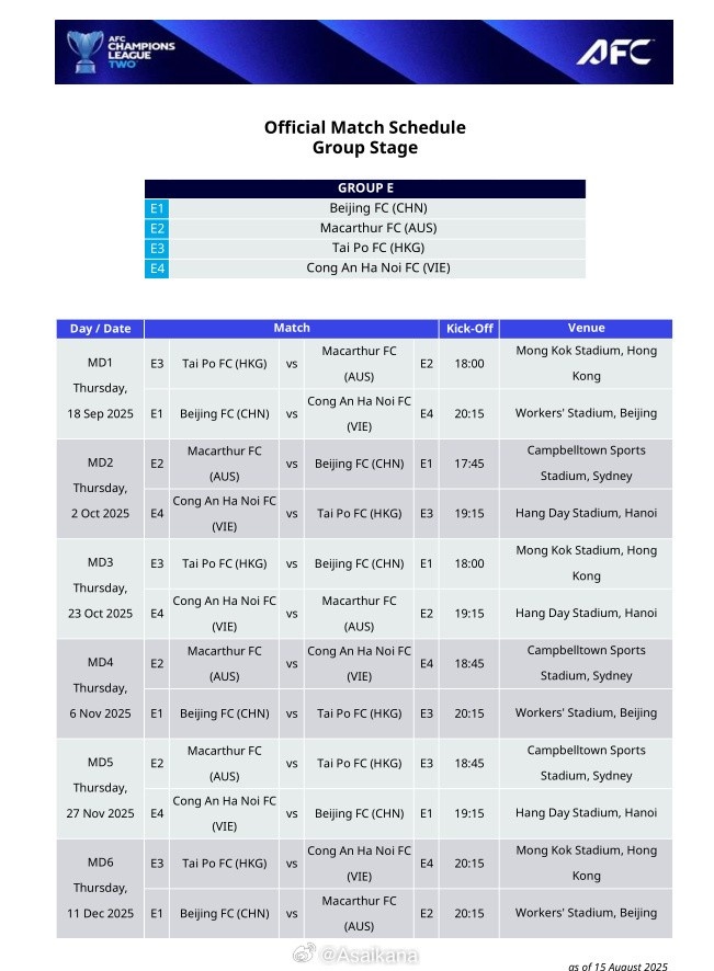 亚足联官网当天早些时辰上传的亚冠二级联赛赛程更新是不正确的,北京国安的赛程本色并未有变化(更新仅为其他小组标黄部安分容),第一场仍为主场对河内公安的比赛,揣度是亚足联职责非常误传了差错版块。赛程以中国足协8月25日在官网发布的版块为准。
