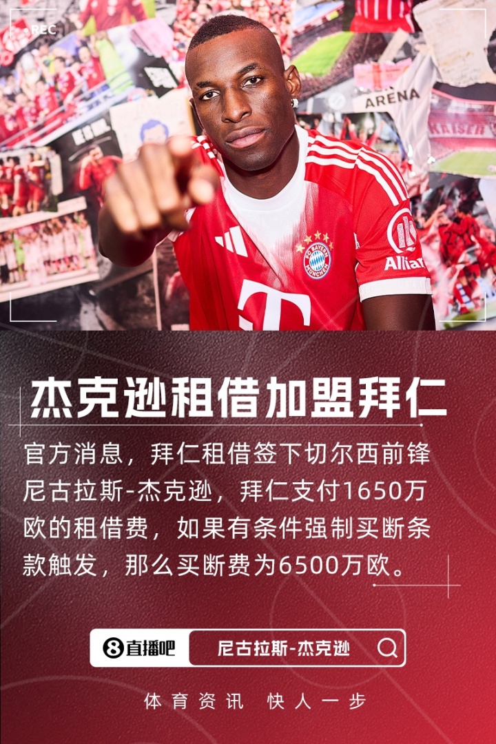 不会掉头!官方:杰克逊租赁加盟拜仁 租赁费1650万欧&6500万买断