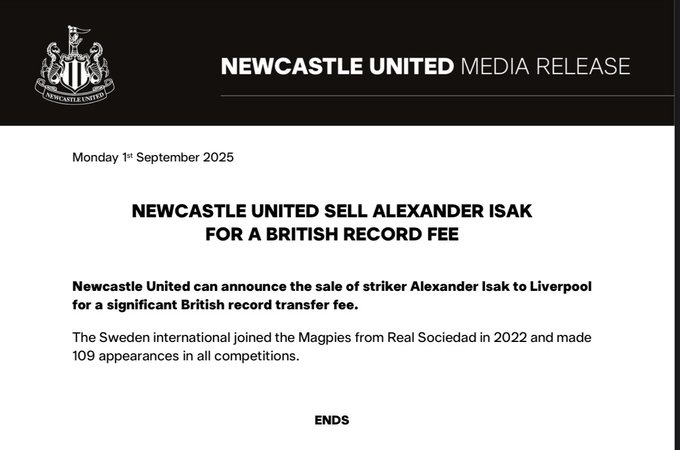 纽卡斯尔官方也发表了伊萨克转会的官方公告,但本色仅37个单词。记者Keith Downie对此发文点评。
