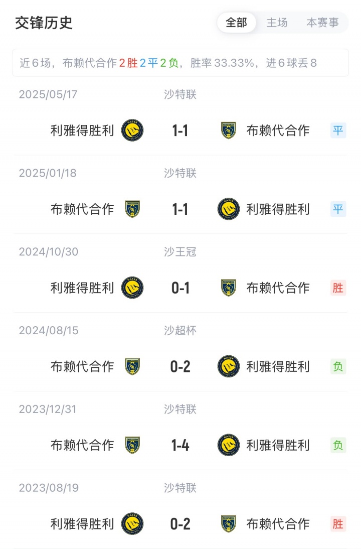 利雅得奏效上赛季名次沙特联第三,布赖代和谐名依次八,近三场径直对接奏效2平1负。
