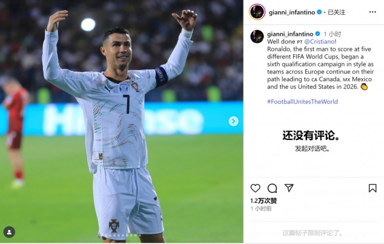 外洋足联主席因凡蒂诺社媒晒出C罗的像片,并写说念:“干得漂亮,克里斯蒂亚诺!手脚首位在五届不同全国杯上进球的男足球员,C罗以出色的施张开启了第六次全国杯预选赛征途,欧洲各队正持续朝着2026年全国杯的主义前进。”
